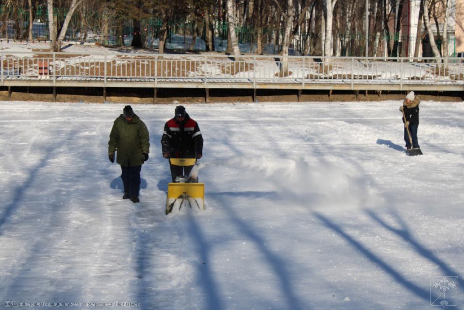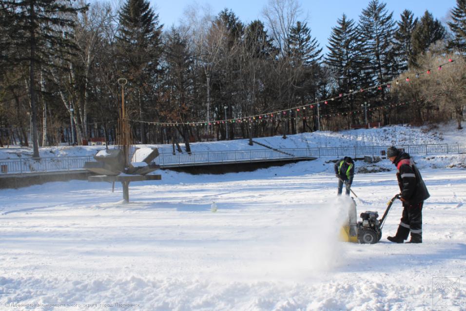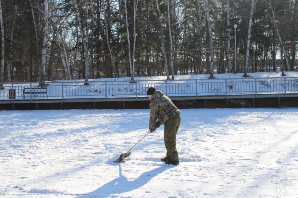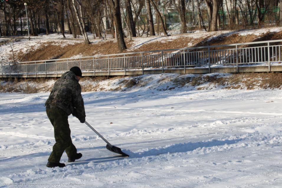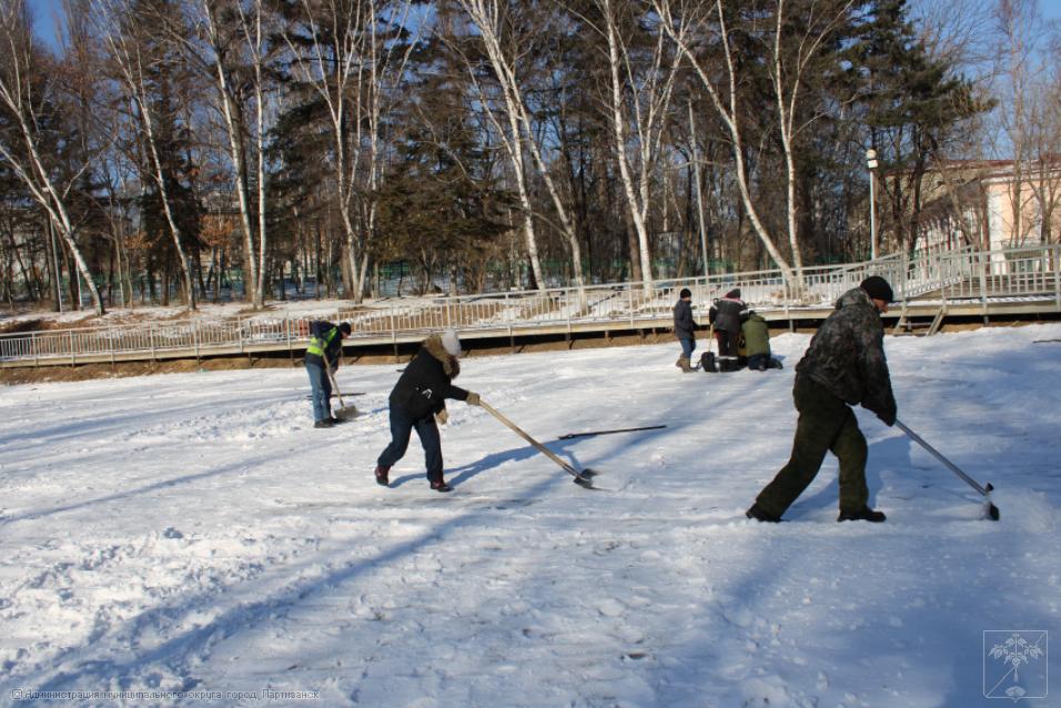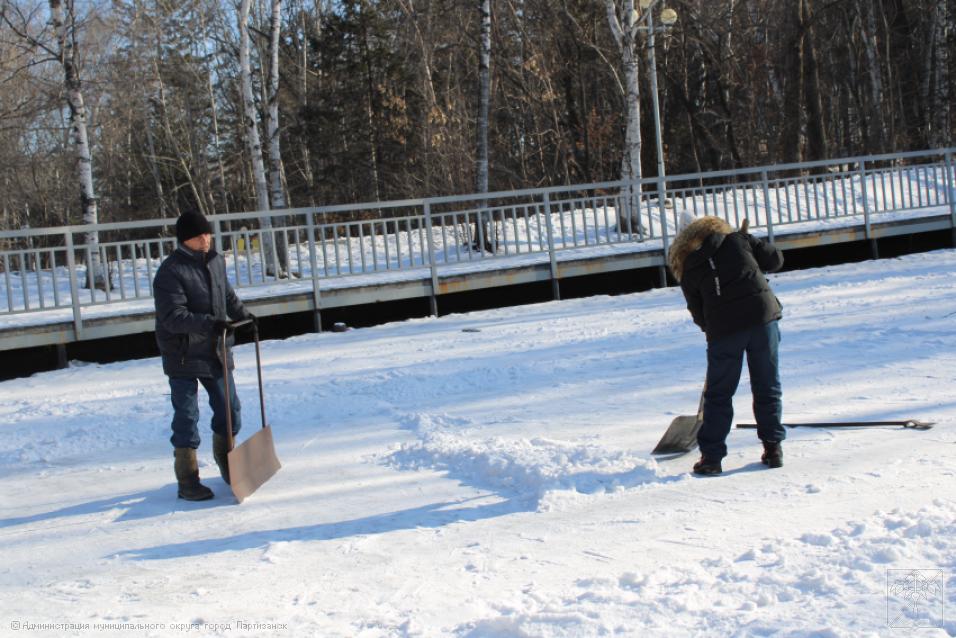 Еще один каток появится скоро в Партизанске – на озере, в городском парке. Сегодня здесь силами работников Городского хозяйства и стадиона «Шахтер» начались подготовительные работы: поверхность озера чистится от снега и мусора, поскольку уже завтра начнется его заливка водой из шлангов.