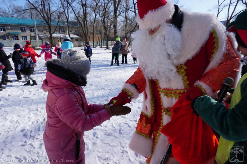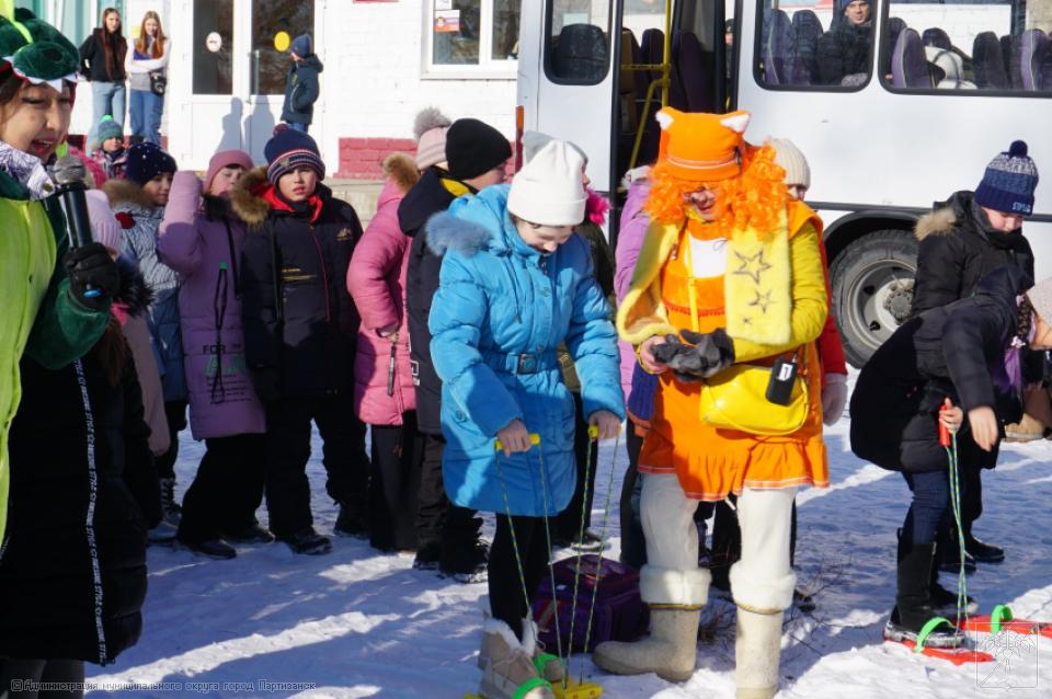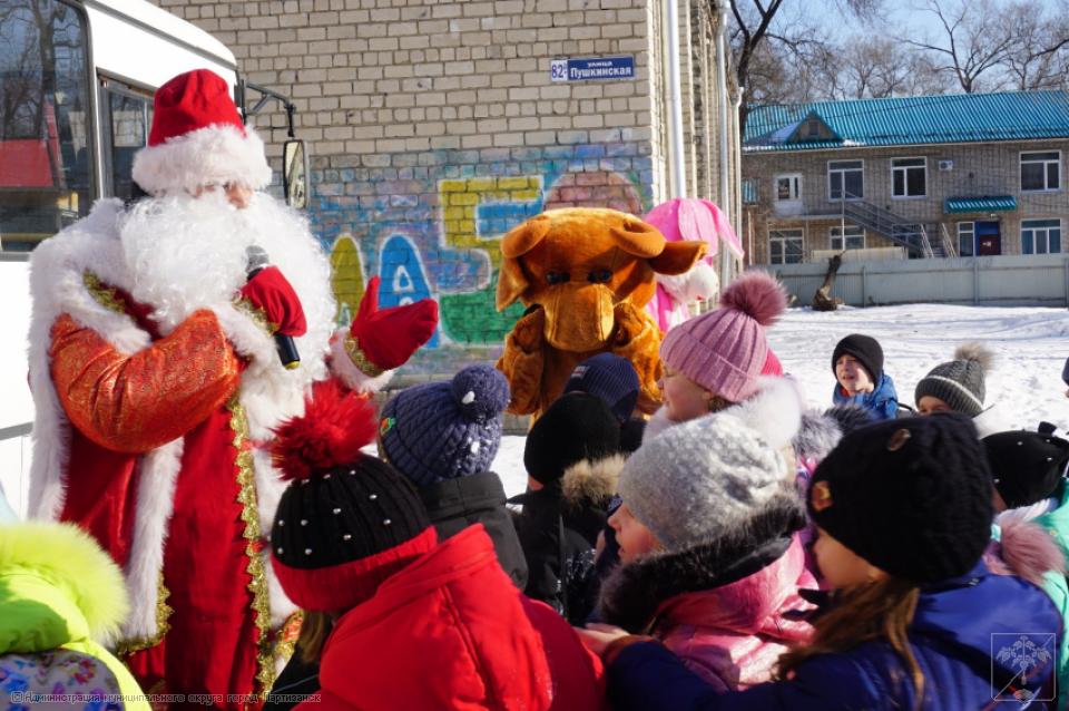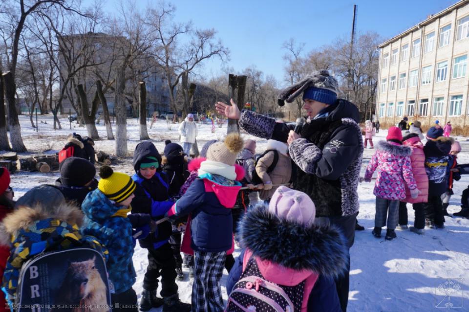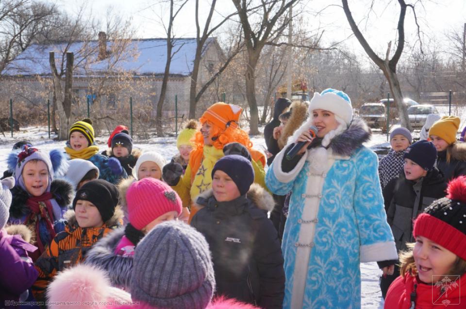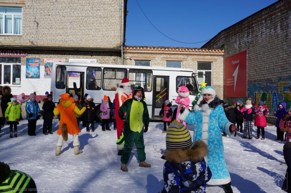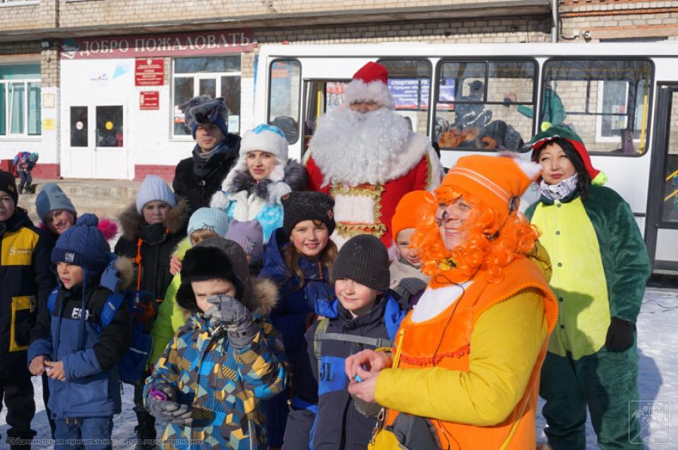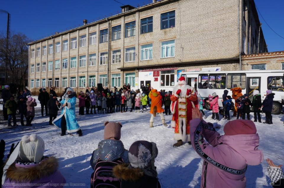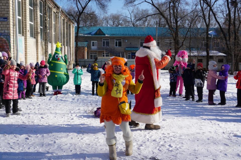 Как только уроки у младшеклассников закончились, они высыпали во двор, где их уже ждал самый настоящий новогодний праздник. Встречали ребят под задорные новогодние песни сказочные герои - Дед Мороз, Снегурочка, Волчок, Лисичка, Дракоша и волонтеры в ростовых костюмах ёлки, бычка и зайчика.